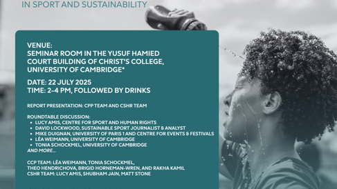 Please join us for a fascinating report launch and panel discussion, at 2-4pm on Tuesday 22nd July 2025, Christ's College (via the Great Gate on St Andrew's Street). The Cambridge Pro Bono Project (CPP) is hosting a report launch event in collaboration with the Centre for Sport and Human Rights.